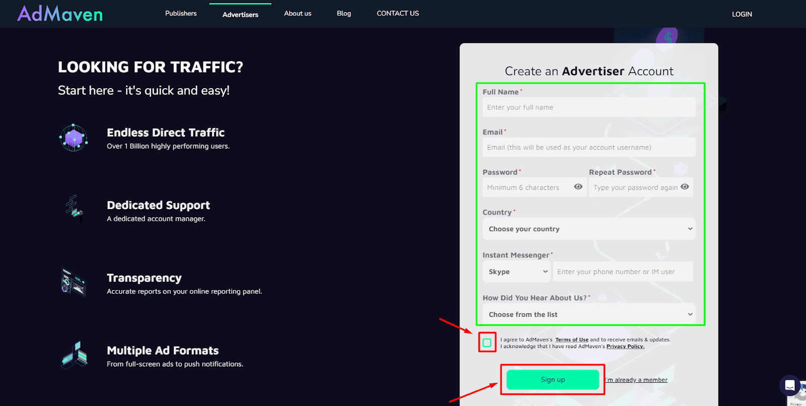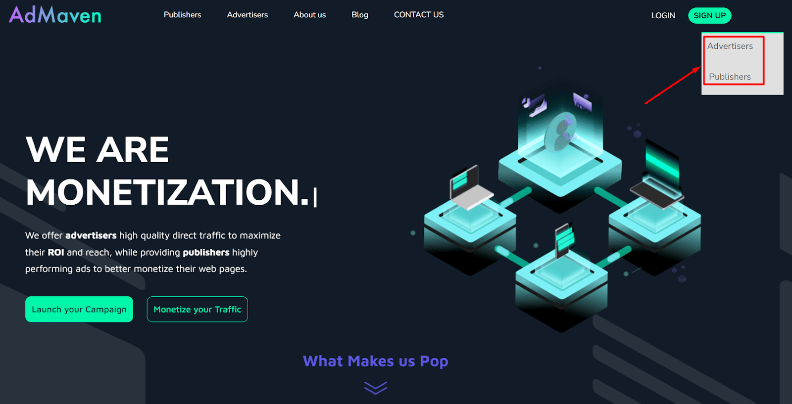 Step - 1: Go to the official website of AdMaven, hover your cursor to ‘SIGN UP’, and choose ‘Advertisers~.~