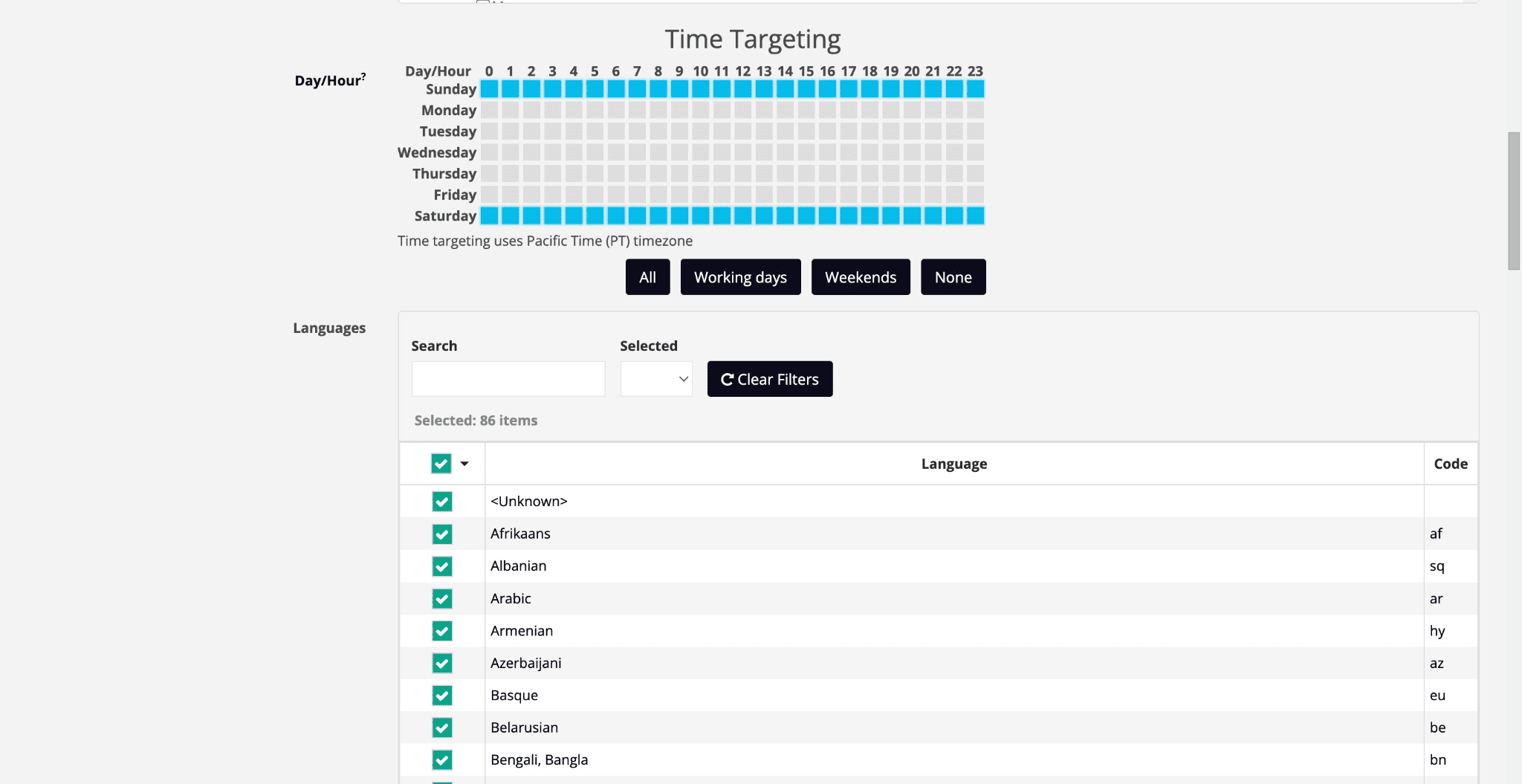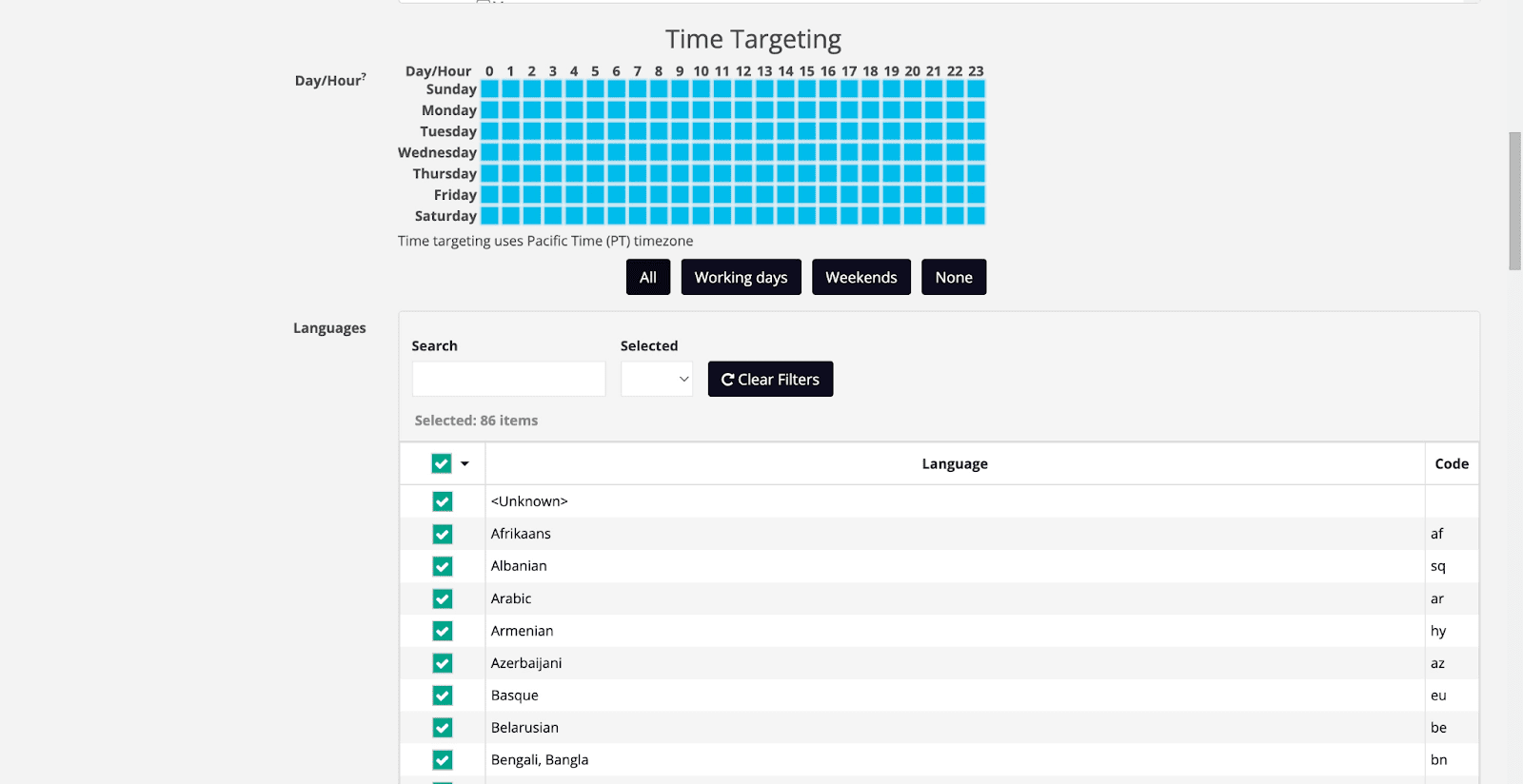 Next is Time Targeting, You can choose which day and hours your campaign must deliver ads.