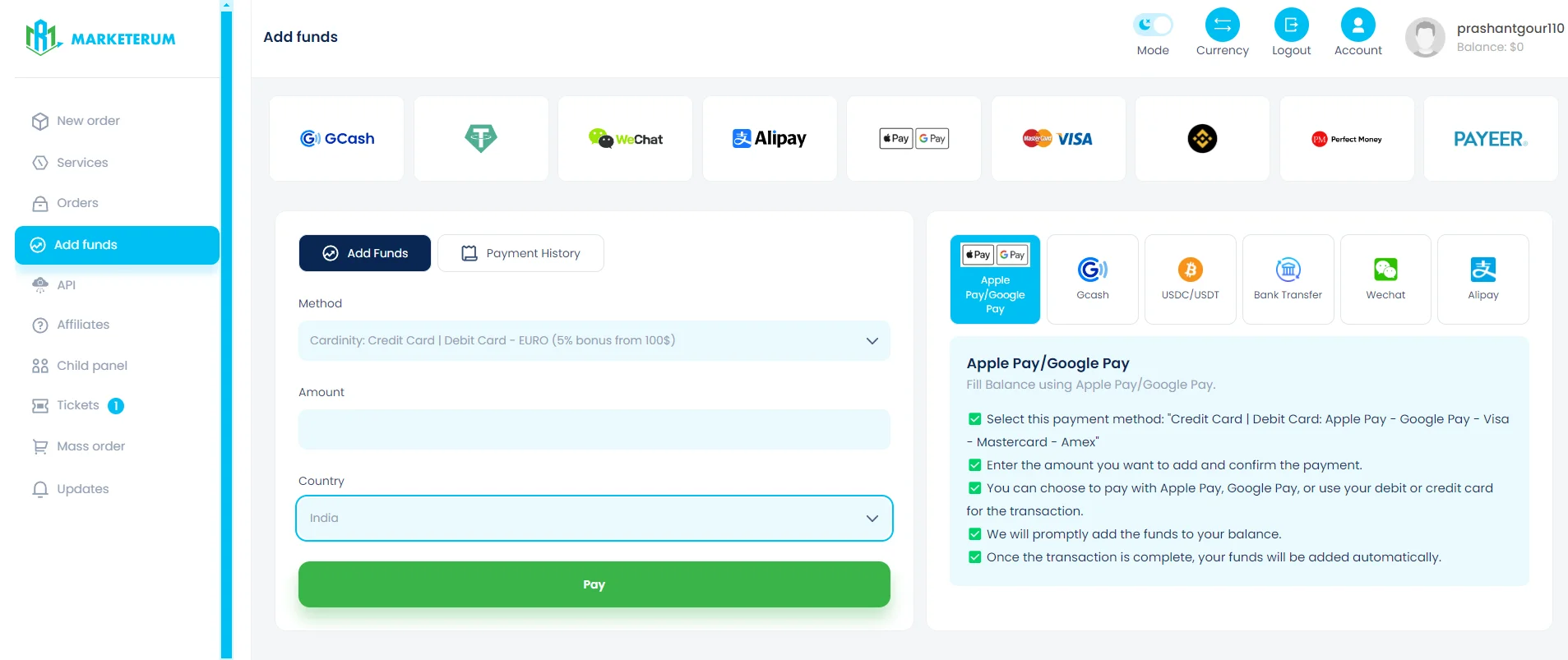 - After logging in, go to the "Add Funds" section. Choose a payment method (e.g., PayPal, Bitcoin, or other available options) and enter the desired amount. Complete the payment to have funds deposited in your Marketerum account.