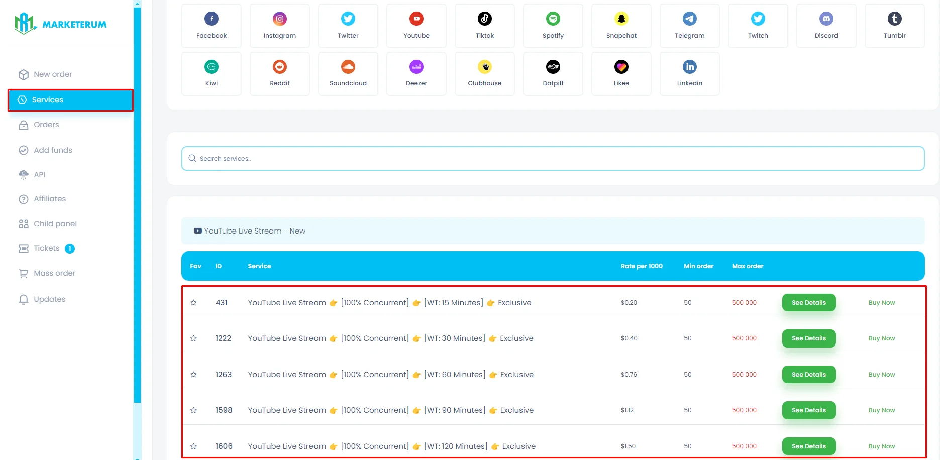 Marketerum is a Social Media Marketing (SMM) service provider. They offer a variety of SMM services for different social media platforms including Facebook, Instagram, Twitter, YouTube, TikTok, Telegram, Twitch, Discord, Snapchat, Clubhouse, Reddit, Deezer, Kiwi, Tumblr, and Likee.